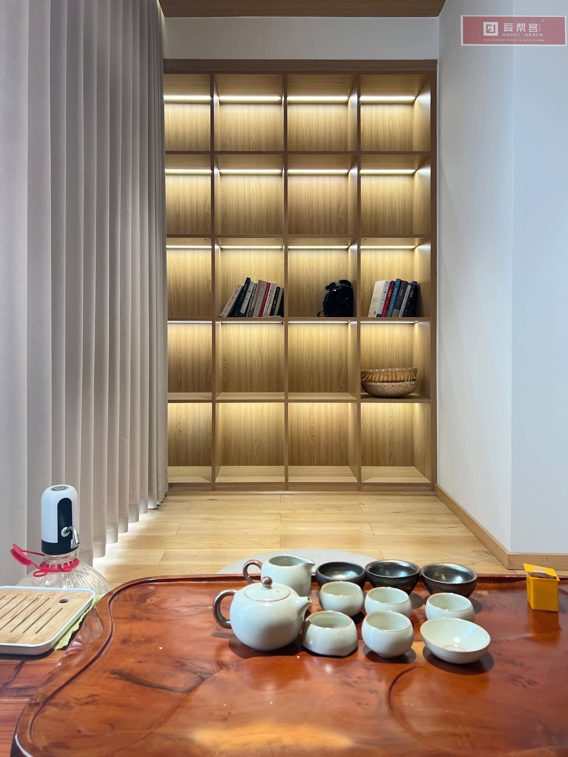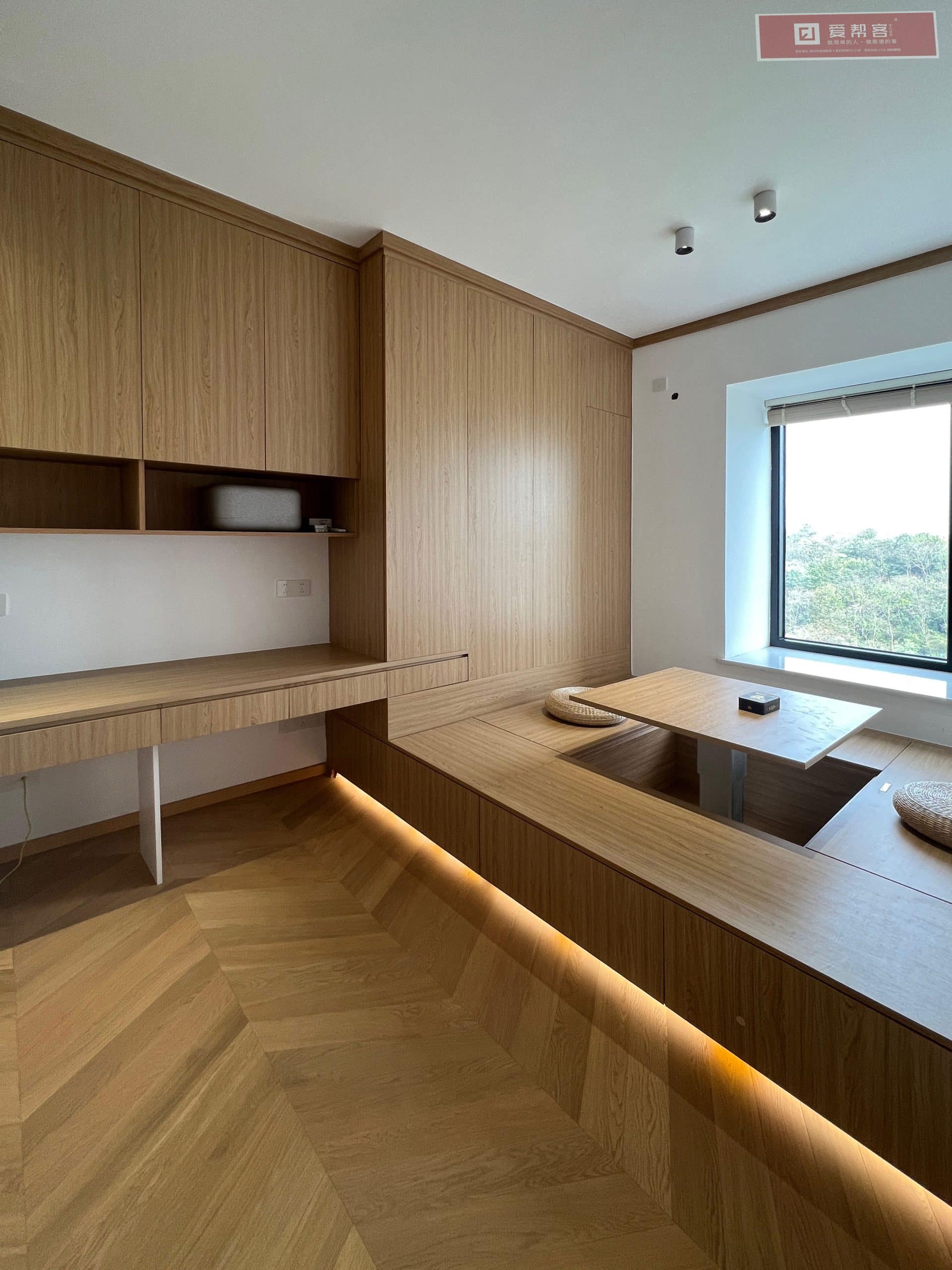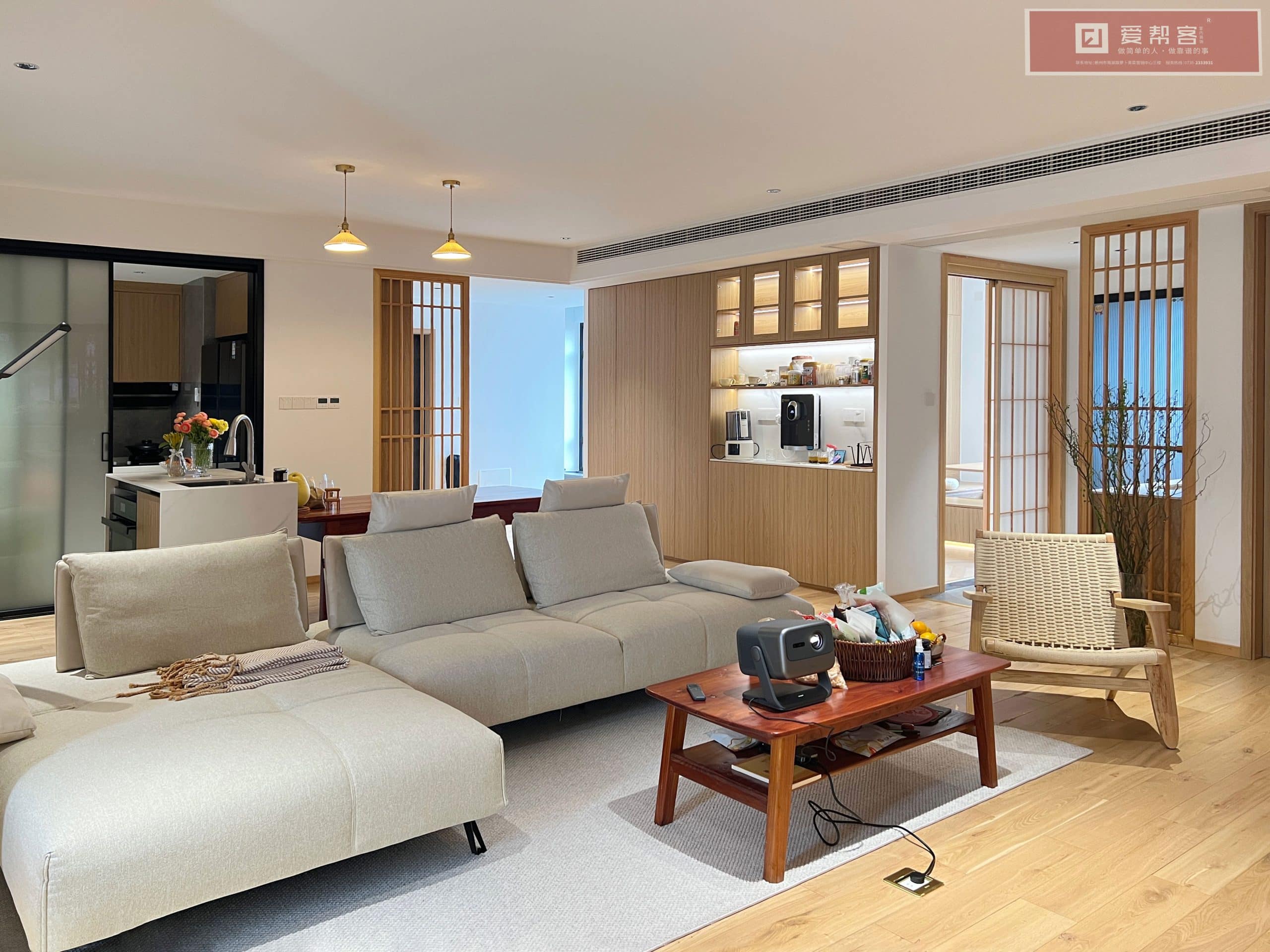 - 材质体系:全屋原木定制柜体、木地板、木格栅造型、涂料及全部主材。